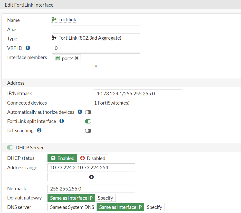The FortiLink Interface IP address on the FortiGate has to be modified in order to allow for the DHCP Server assigned to this interface to be active.