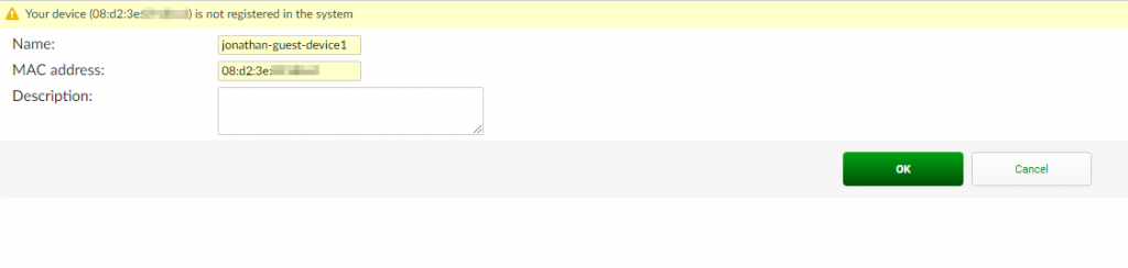 Since the FortiAuthenticator has been configured for device tracking, when a guest user logs in with their registered account, they will be prompted to acknowledge the device with the name and MAC address that will be recorded as part of the user’s devices.