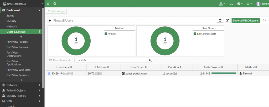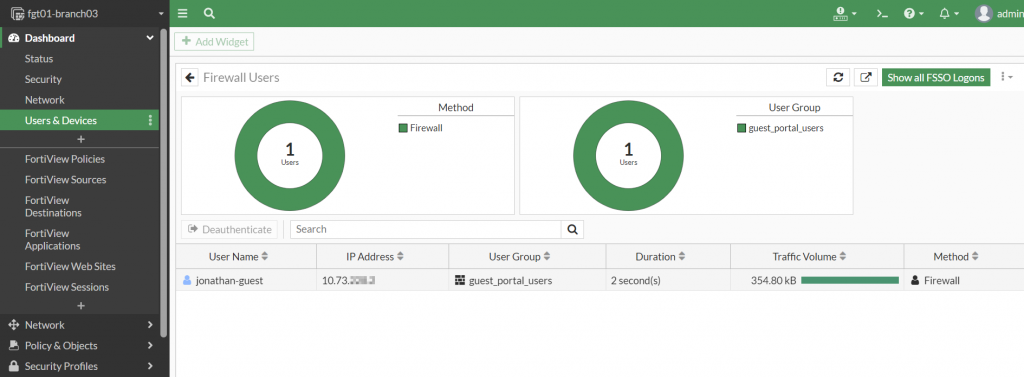Upon the initial logon with the registered device on the FortiGate wireless network, the user will be tracked by their username they successfully authenticated to the portal with. This is viewable from the “Dashboard | Users & Devices | Firewall Users” monitor widget as shown in the screenshot below: